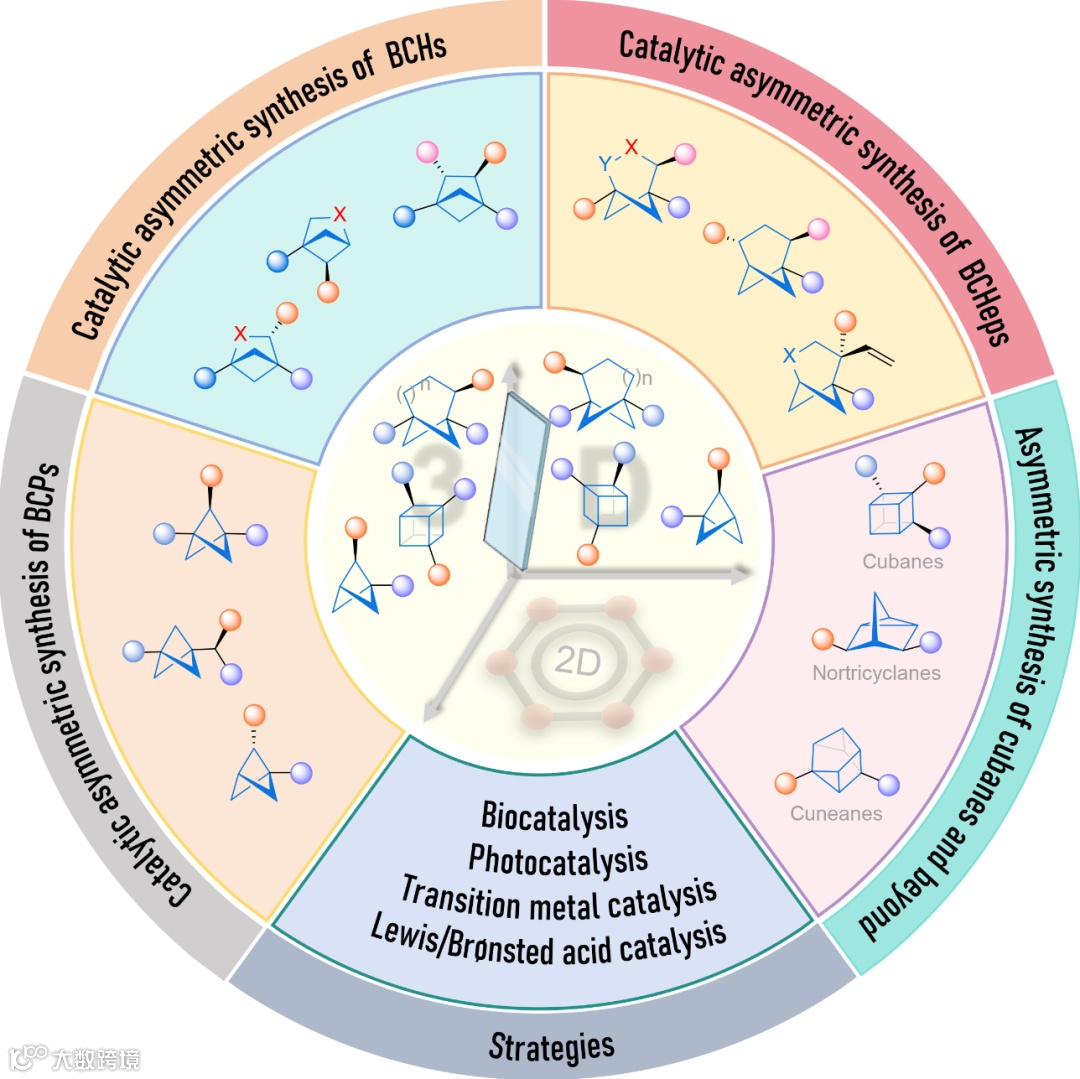 近两年来,合成化学家们在这一领域取得重要突破,他们通过使用酶催化、光化学不对称催化、手性过渡金属催化、手性Brønsted酸催化以及手性路易斯酸催化,为双环[n.1.1]烷烃、立方烷及其它三维笼状饱和骨架的构建提供了高效、高选择性的不对称催化合成方法。