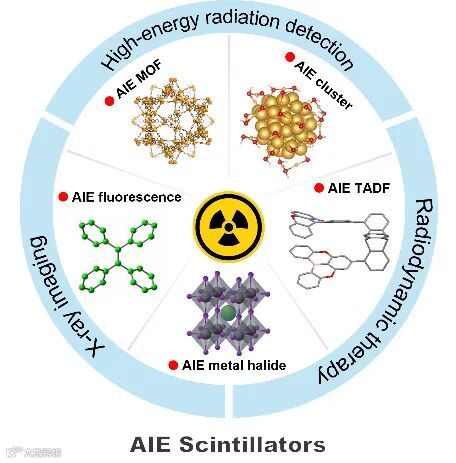 到目前为止,科学家发展了一系列方法来克服上述有机闪烁体的缺陷。一方面,在有机闪烁体分子上直接引入重原子或者利用金属团簇、有机-无机杂化体系、有机金属骨架 (MOF) 中的金属原子来提高对高能射线的吸收能力,从而提高闪烁体的综合性能。另一方面,利用各种高能射线敏化剂和发射中心,如热致延迟荧光 (TADF) 分子、磷光配合物等来构建具有高效能量转移的闪烁体体系。这些工作有效提高了闪烁体的光产额、激子利用率以及能量转移效率。然而,上述的有机闪烁体和/或有机-无机杂化闪烁体都存在一个难以克服的问题,即ACQ现象。传统闪烁体在应用层面,分子越聚集而发光性能越差,这极大限制了有机闪烁体的进一步发展和应用。幸运的是,AIE材料的发现,打破了这一僵局。科学家通过合理的分子设计和制备技术,可以赋予闪烁体AIE性质,可有效克服传统闪烁体的固有缺陷。AIE闪烁体在过去五年 (特别是近三年) 中取得了快速发展,与传统闪烁体相比,AIE闪烁体表现出卓越的性能。例如,通过分子设计和制备技术赋予闪烁体AIE性质,不仅有效抑制了ACQ现象,同时这些AIE闪烁体具有高的X射线成像分辨率、高的光产额、低的X射线检测限和短的辐射发光衰减寿命。此外,AIE闪烁体往往表现出传统闪烁体所没有的独特性质。如在聚集态下的多刺激响应行为等。另外,与传统闪烁体相比,AIE闪烁体表现出更广泛的应用。例如,在生命科学领域,可将其用于肿瘤诊疗一体化,协同放射治疗或放射动力治疗等策略改善肿瘤的治疗效果;在光电领域,AIE闪烁体被应用到光通讯、发光器件等。