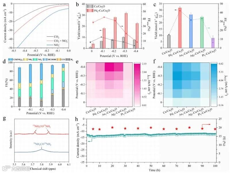 电催化测试表明,Pd-Cu双位点催化剂在CO2与NO3-还原动力学匹配性上优于Au-Cu、Ag-Cu和Pt-Cu等对比催化剂,实现31.8 mmol h-1 gcat.-1的尿素生成速率和42.2%的法拉第效率,并保持100小时稳定性。此外,Pd1-Cu/Cu2O的电催化C-N耦合能力还可拓展至苯胺与CO共还原合成乙酰苯胺,产率高达1021.2 mmol h-1 gcat.-1,法拉第效率为23.7%。
