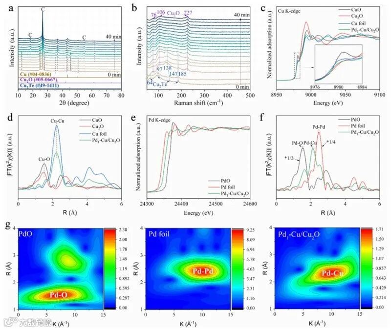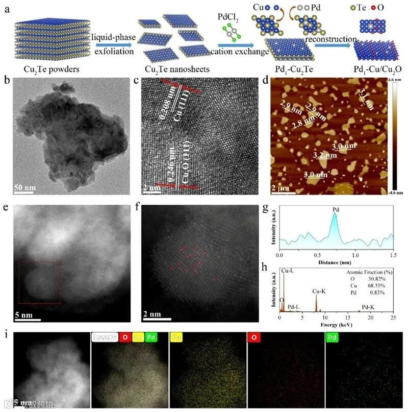 近日,合肥工业大学吴玉程教授团队王岩教授、张剑芳副研究员联合香港城市大学张文军教授以及安徽师范大学王鹏教授创新地利用Pd1-Cu2Te纳米片的可控重构,制备出具有原子级分散特征的Pd桥接Cu/Cu2O(Pd1-Cu/Cu2O)催化剂。研究表明,该催化剂独特的Pd-Cu双活性位点能够精准调控关键C、N中间体的平衡生成,有效协同C-N耦合反应的热力学与动力学过程,从而显著提升尿素合成的效率与选择性。值得一提的是,该催化剂能够实现CO与苯胺耦联生成乙酰苯胺,为电合成高附加值酰胺类产物提供了新途径。