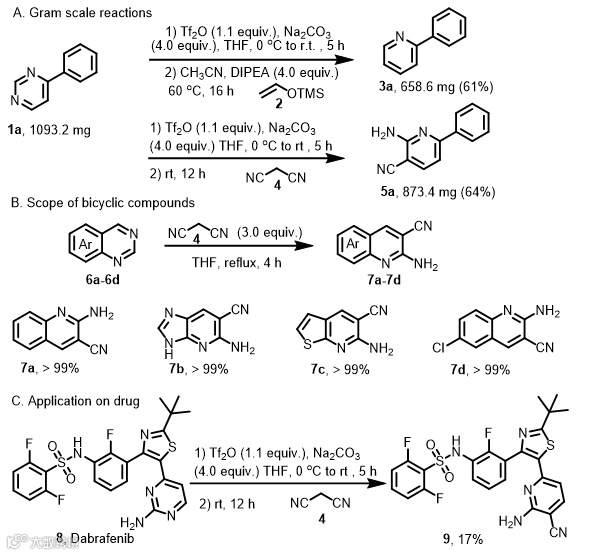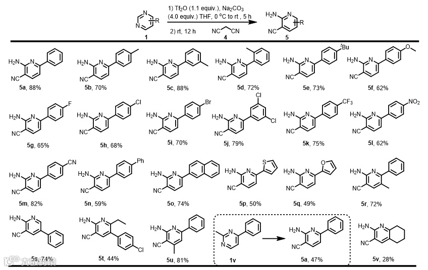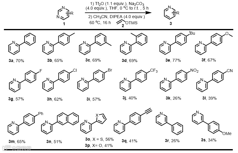 首先进行三氟甲磺酰化,活化的嘧啶盐进一步与烯醇硅醚反应得到吡啶化合物。接着,本文对多种嘧啶底物进行了探索,反应大部分能顺利得到吡啶产物。