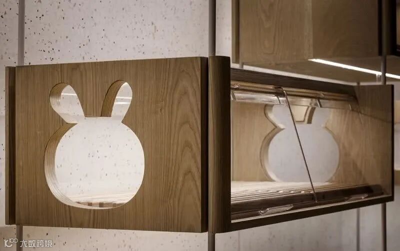 面包柜的开口因为客人选购时不同的视线而被区别对待。在儿童视点的高度,设置儿童区箱体,放置适合小孩子口味的面包2块侧板设置卡通图案,(如日本漫画中出现的卡通图案一样)造型卡哇伊。将上面盖板往内退,做成斜开口的方式。同时箱体背板和盖板互相连接处做成一块超透玻璃,更大程度的展示放在箱体内的面包。小孩子选购甜甜圈时的快乐,也被反映在其中。