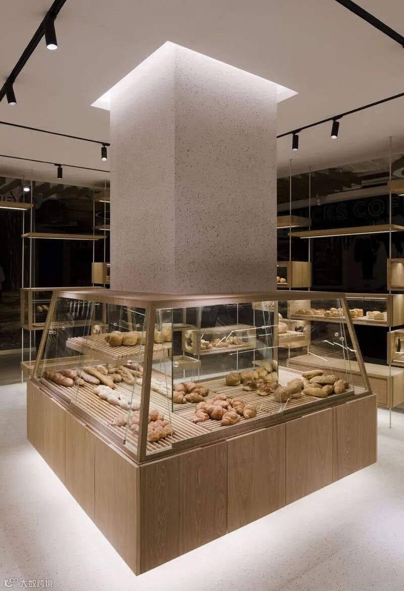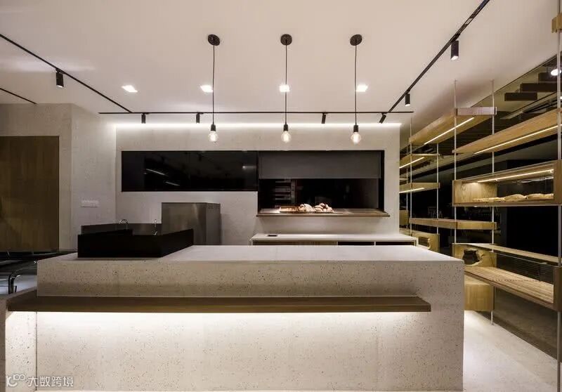 选取米色石材,贴满整个墙面,地面。正如在制作面包的过程中,奶白色的面粉撒上芝麻粒,从视觉的感官程度中能更好的激发消费者的购买欲望。