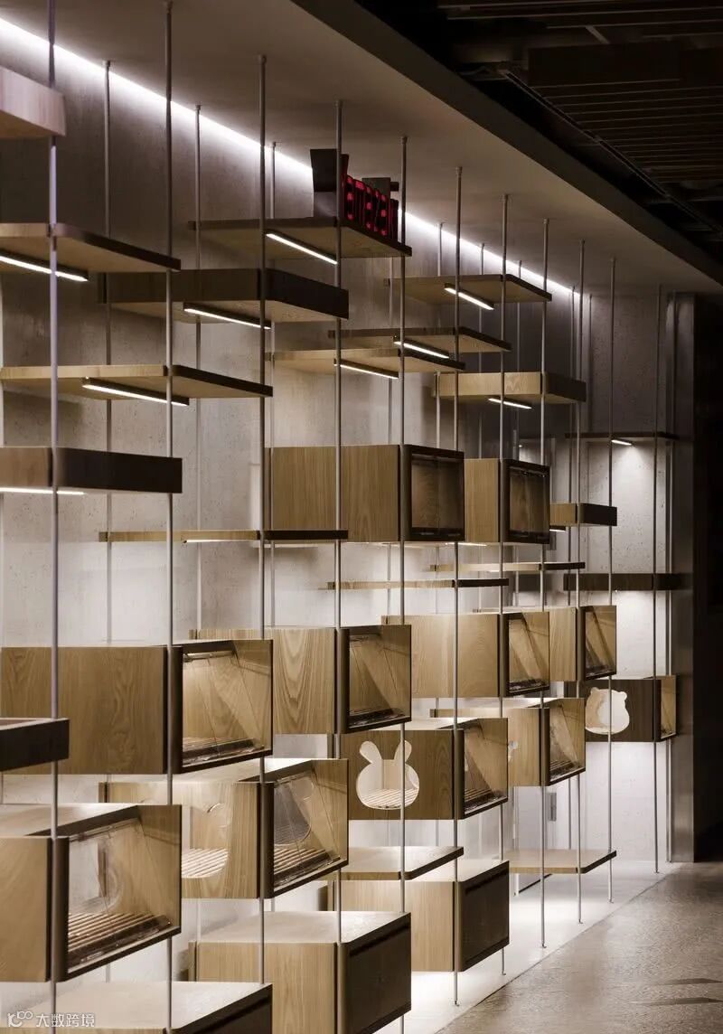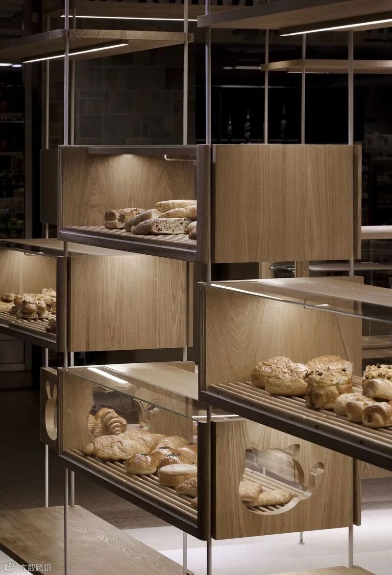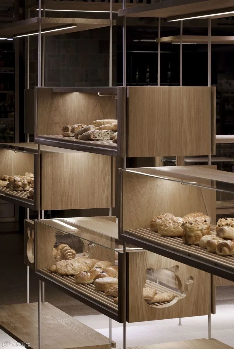 为了削弱面包柜体的体量,又能保持展示区的连贯性,横向结构的层板,很好的将整个面包店铺得到一个延伸和展示功能。创造出一种被面包包裹的感觉,使其独立出商场多样而又复杂性的环境,成为整个商场视觉中心的焦点,从商场主通道的任何一个角度都可以望见漂浮的面包。所有承载面包柜的竖向结构均被最小化,远看面包柜像被漂浮在空中。