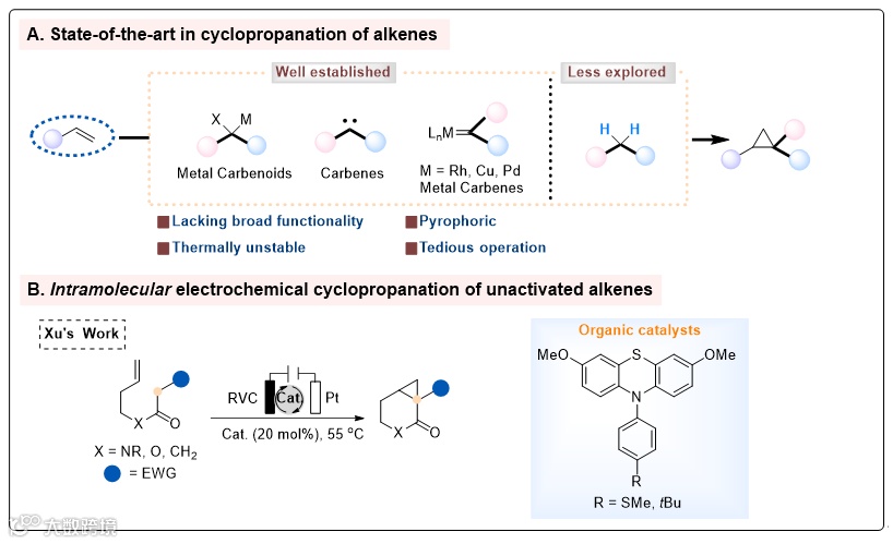 。近期,徐海超课题组通过电化学途径成功实现了分子内的环丙烷化反应(