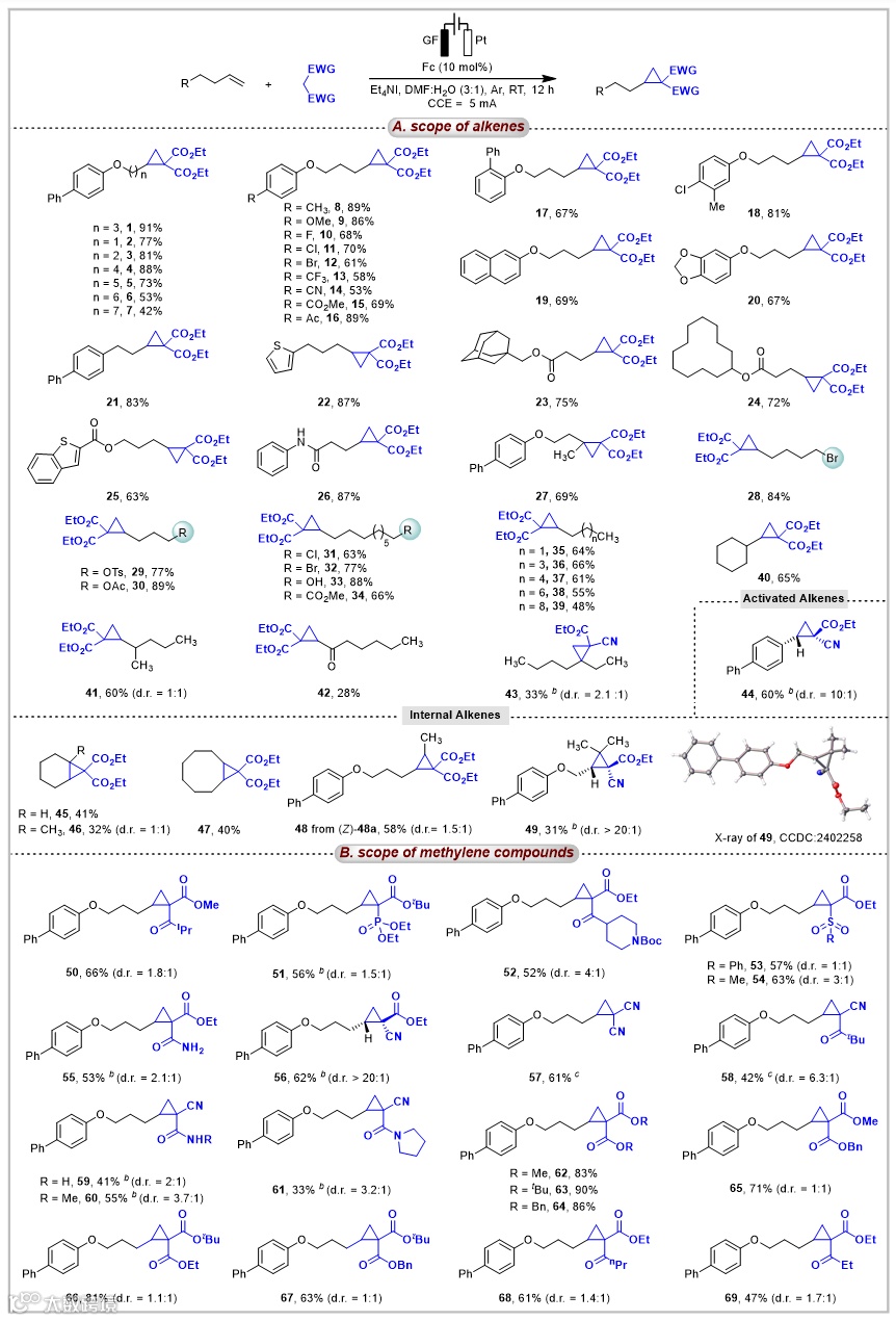 【有机】南开大学仇友爱课题组Angew:电化学未活化烯烃环丙烷化反应