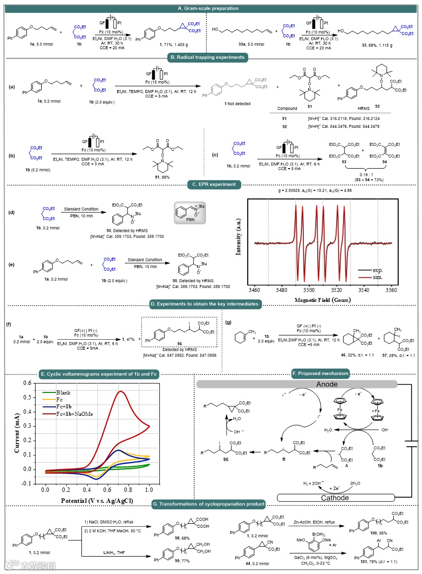 )是该转化过程中的关键中间体(图5D)。作者接下来进行了一系列的CV测试(图5E),证明了Fc作为媒介将活性亚甲基试剂转化为碳自由基。此外,作者还进行了环丙烷化合物的衍生化实验,得到了一系列衍生化的产物(图5G)。