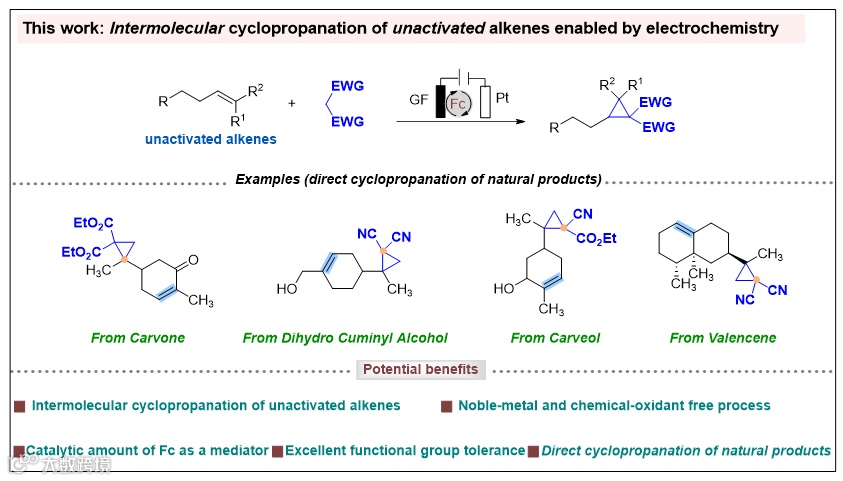 导读:仇友爱课题组报道了电化学条件下未活化烯烃与活泼亚甲基化合物的环丙烷化反应