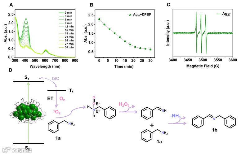 纳米团簇在光催化苄胺氧化偶联反应的应用,揭示了重要的构效关系。实验结果证明