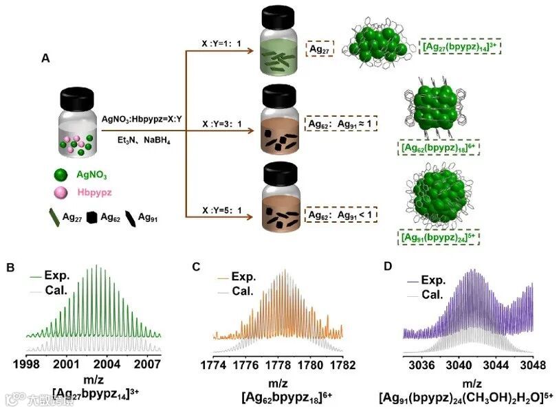 方面取得重要进展。利用多齿螯合氮配体3,5-二(2-吡啶基)吡唑(Hbpypz)构建了三个前所未有的银纳米团簇:
