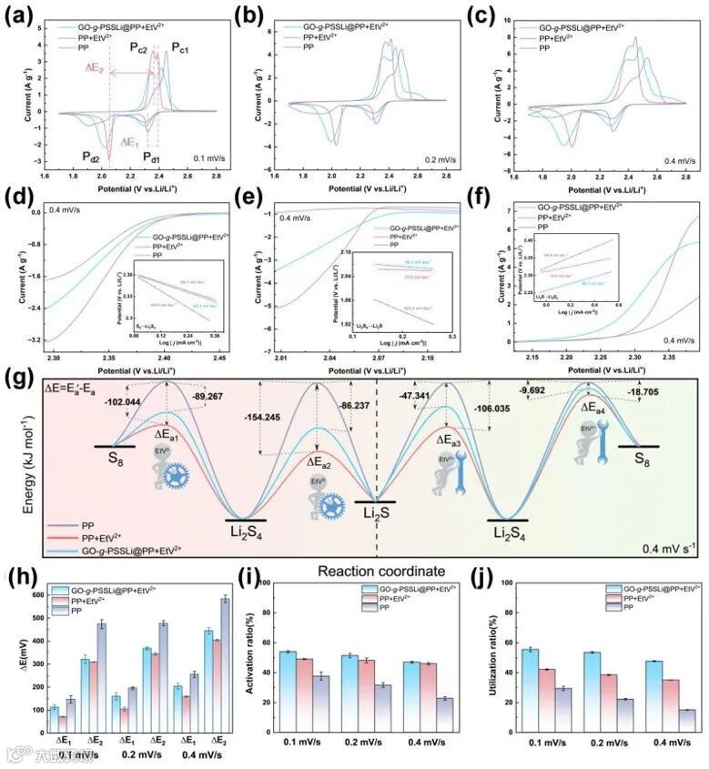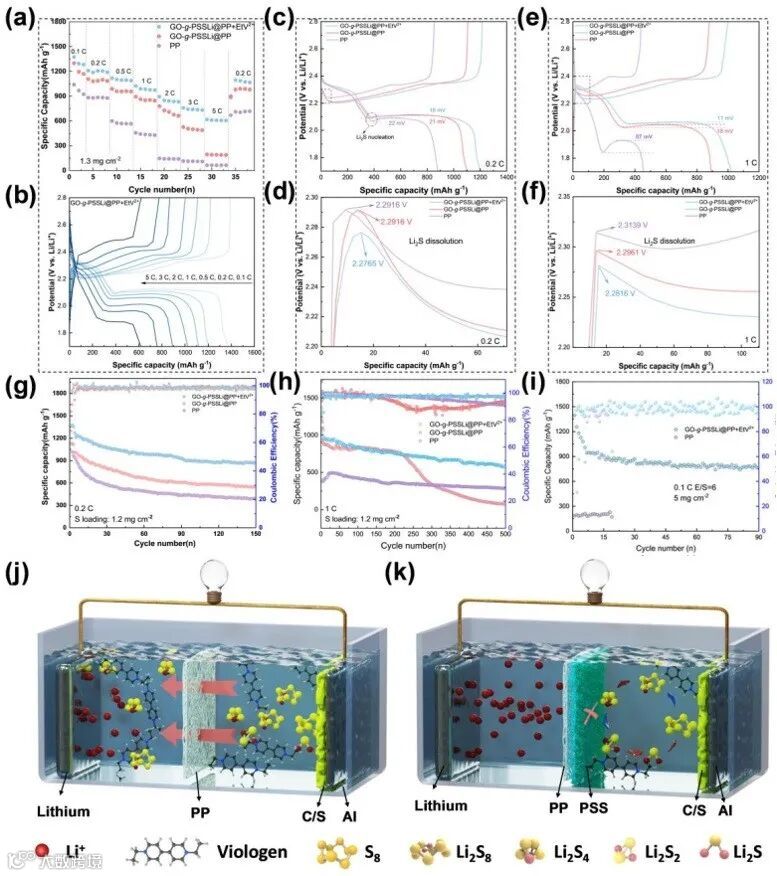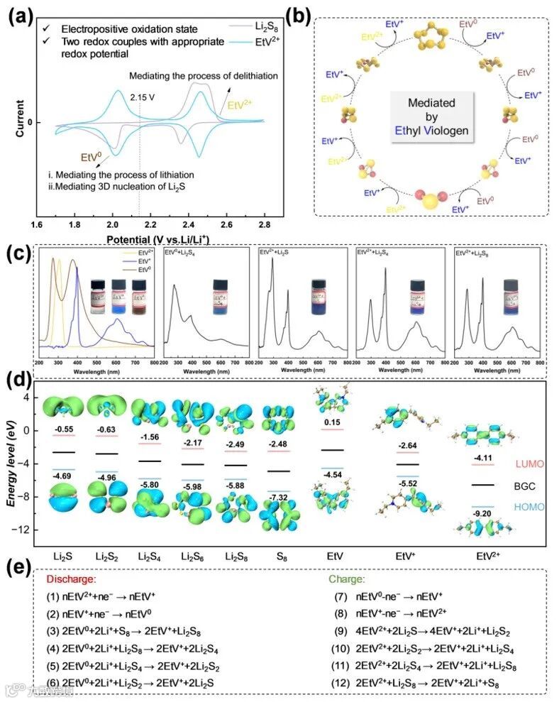 总之,本文提供了一种通过多功能RM分子 (电正性、介导电子转移) 与末端含有-SO3-基团的电负性功能化PP隔膜 (抑制穿梭效应、介导锂离子传输) 的协同策略,使得硫物种转化的势垒大大降低(S8→Li2S4→Li2S2→Li2S→Li2S2→Li2S4→S8),特别是对于Li2S成核过程。最终在5 mg cm-2的高S负载和6 μL mg-1的低E/S比下,协同策略使商用的CNTs基硫正极提供了更高的放电容量(1006.93 mAh g-1)和更长的循环寿命。该研究为多功能RM的设计提供了重要指导,并为开发协同策略系统解决涉及中间体的转换型电极的复杂电化学问题提供了重要参考。