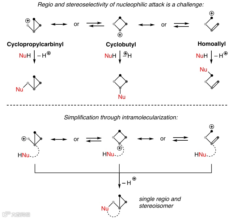 关键之处在于羧酸盐对环丙基甲基阳离子的分子内捕获。