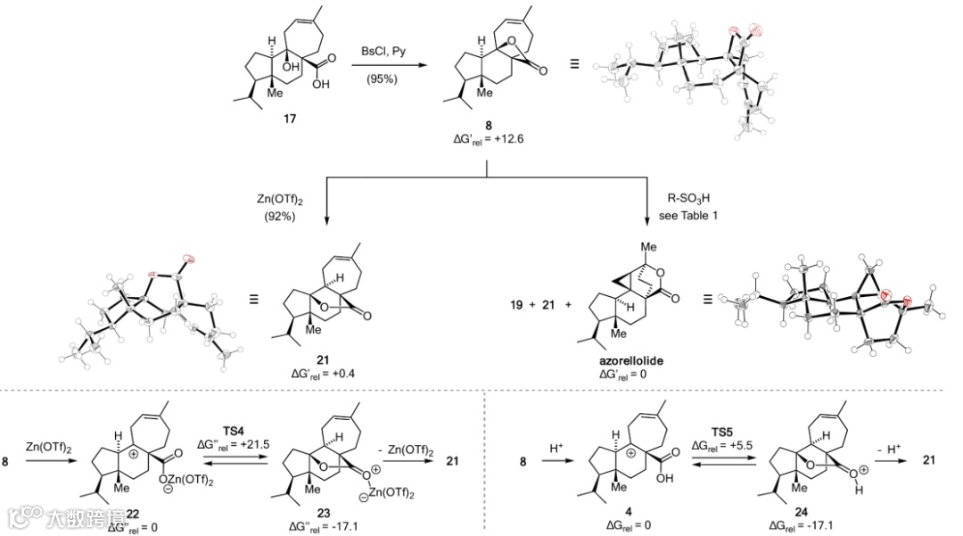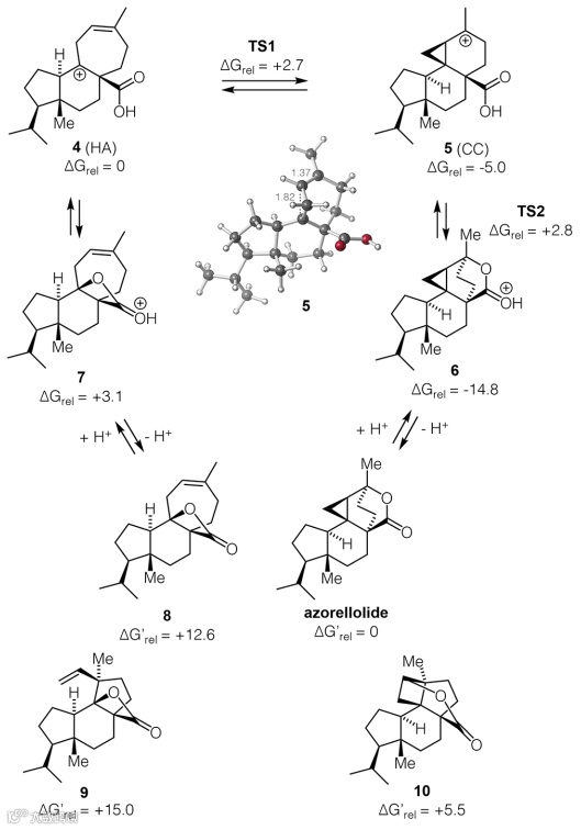 )可将azorellolide的分离产率提高至48%(51% BRSM)。最后,作者借助量子力学计算来解释这些结果(图5)。对于质子和Lewis酸促进的重排,预计初始开环至