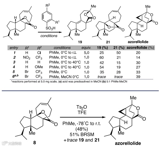 置于5 equiv 4-氯苯磺酸中可获得20%的azorellolide,因此作者系统地探索了磺酸的电性,发现带有吸电子基团的磺酸(如:2-硝基-4-三氟甲基苯磺酸)会使azorellolide 的产率降低至14%,导致