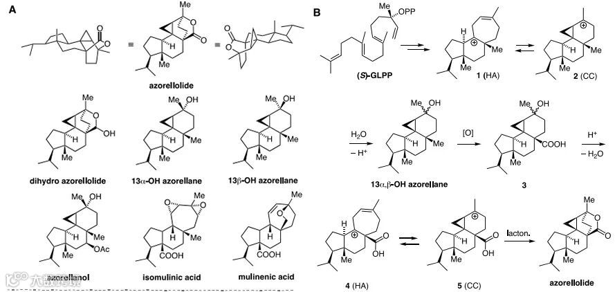 nic酸或异mulinenic酸)一起分离,这些多烯二萜的特征是具有氧化的5/6/7骨架。如图2B所示,azorellolide可能的生物合成途径如下:首先,香叶基-芳樟基焦磷酸(GLPP)环化、伴随着甲基和氢迁移可以得到HA阳离子