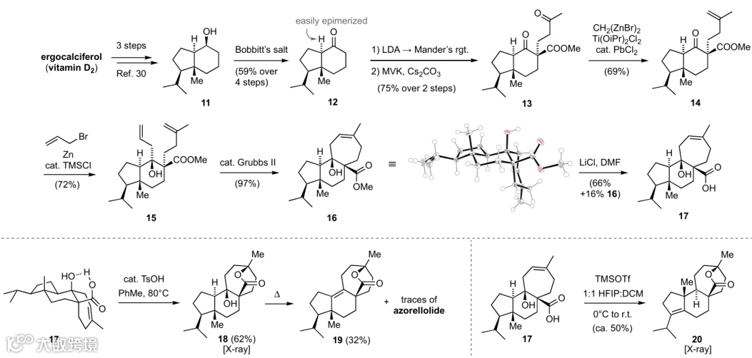 本文从已知的 hydrindanone(从市售原料开始,需要12步合成)出发,经8步转化合成了复杂的二萜azorellolide,这也是azorellane类成员的首次合成。该反应的关键之处在于张力β-内酯(
