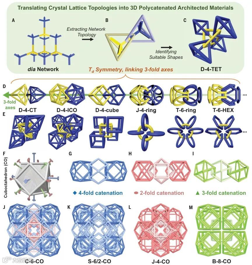 传统的晶格结构可以映射成由节点和连接组成的连续拓扑网络(上图A)。PAM的设计策略从选定晶体网络开始,研究者创建了周期性纠缠的环形、多边形或多面体笼状颗粒,作为PAM的结构单元。首先识别连续网络中的节点对称性,并将其与具有这些对称性的颗粒对应(上图B)。相邻颗粒相互连接,复制原始的网络连接(上图A至C),如此以来,晶体晶格拓扑就可以转移至PAM。单个节点可以使用各种形状的颗粒来表示,例如多面体、多边形簇或环面簇(上图D)。根据组成单元的性质不同,所得到的多链体系结构的拓扑也不同(上图E)。给定的颗粒形状(例如立方体(CO))可以表现出多个对称轴(上图F),这意味着多种潜在的连接环境(上图G至I)。通过单独或组合利用这些连接,就可以创建各种PAM(上图J至M),每个PAM都有自己的全局拓扑。为了便于识别,研究者使用了一个三部分命名方案,X-n-abc,其中“X”表示网络拓扑,“n”表示每个颗粒的连接数,“abc”表示颗粒形状。例如,D-4-TET(上图C)表示由四面体(TET)组成的多链