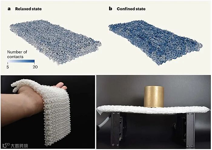 )。不受力的状态下,这种织物就像普通布料一样柔软;但在施加压力下,织物中三维结构颗粒单元会互锁并卡住,使得织物由软变硬,并可承担一定的负载。这种变化完全可逆,也就是说,压力撤去之后,织物又可恢复柔性状态。与锁子甲由无数小环链接而成不同,他们的智能织物由八面体颗粒单元间形成多点互锁。