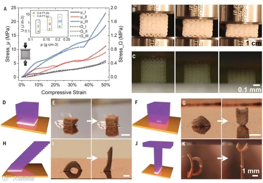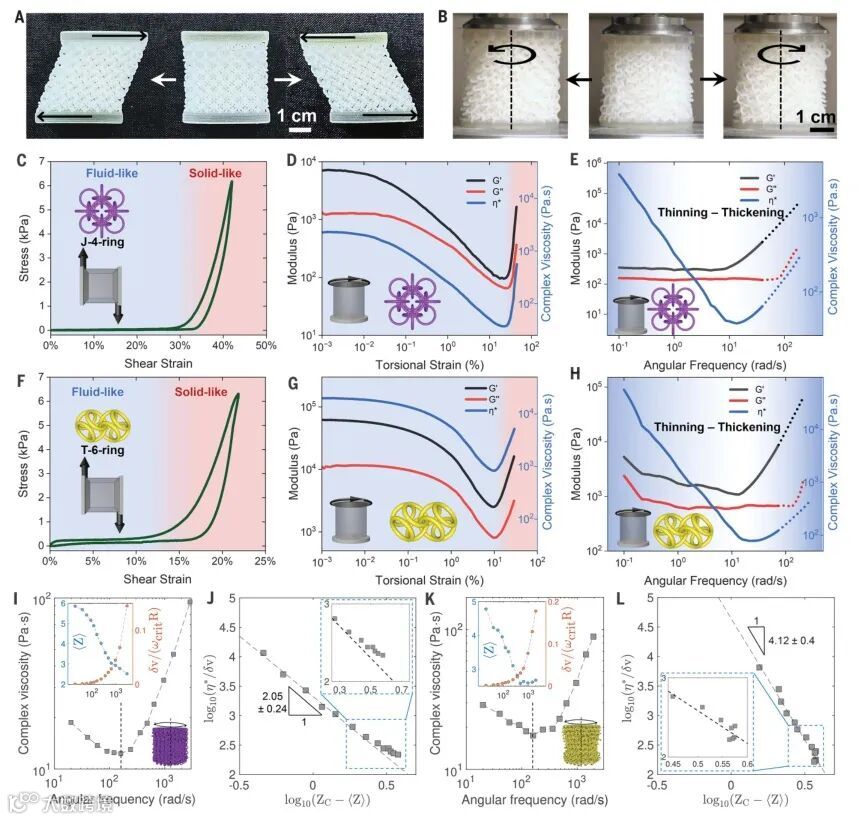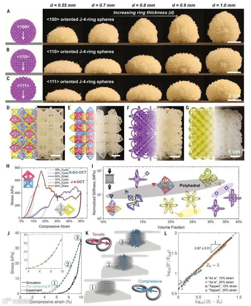 研究者使用包括丙烯酸聚合物、尼龙和金属在内的多种材料,3D打印出这些PAM结构,大多数原型都是边长5厘米左右的立方体或直径5厘米的球体。随后,研究者进行了各种测试,来了解PAM的机械性能。“我们从压缩开始,”Wenjie Zhou博士解释,“然后我们尝试了简单的剪切,施加一个横向力,就像你试图撕裂材料时所做的那样。最后,我们做了流变学测试,看看材料对扭曲的反应,首先是缓慢的,然后是更快、更强的。”在某些情况下,这些PAM表现得像液体。“想象一下对水施加剪切应力,”Wenjie Zhou博士说。“不会有任何阻力。PAM的环和笼组成单元相互滑动,因此许多PAM具有很小的剪切阻力。”但当这些结构被压缩时,它们可能会变得完全刚性,表现得像固体一样