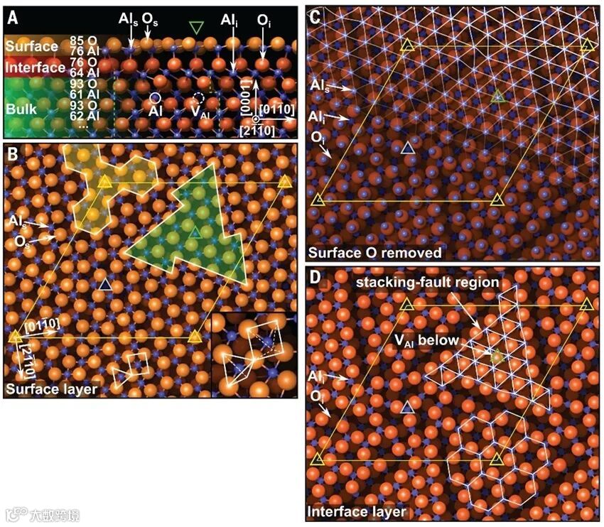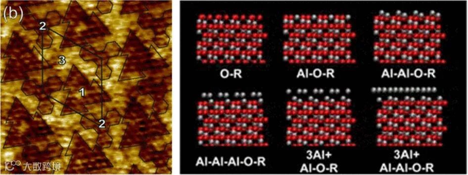 赤铁矿表面nc-AFM测试图像。图片来源:Adv. Mater. Interfaces[3] Al2O3的体相晶格为六方紧密堆积结构,每个铝原子与上下三氧原子配位,形成了(Al-O3-Al)n的层叠单元。然而,表层铝原子由于缺少上层氧原子,无法形成配位,导致其pz轨道无法与相邻氧原子键合。根据电负性估算,未键合的铝pz轨道的能量成本约为0.8 eV。未充分配位的表层铝原子发生显著的内向松弛,造成表层和过渡层的压缩应力。这两层原子重构显著降低了能量,有效地稳定了结构。其他刚玉类氧化物,如氧化铬(Cr2O3)、赤铁矿(Fe2O3)的表面也存在重构趋势,赤铁矿与表现出与Al2O3相似的表面重构特性。
