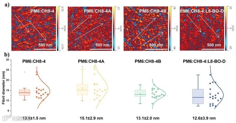 下测试的红外AFM图像;(b) PM6:CH8-4/4A/4B和PM6:CH8-4:L8-BO-D的纤维粒径统计分布图。