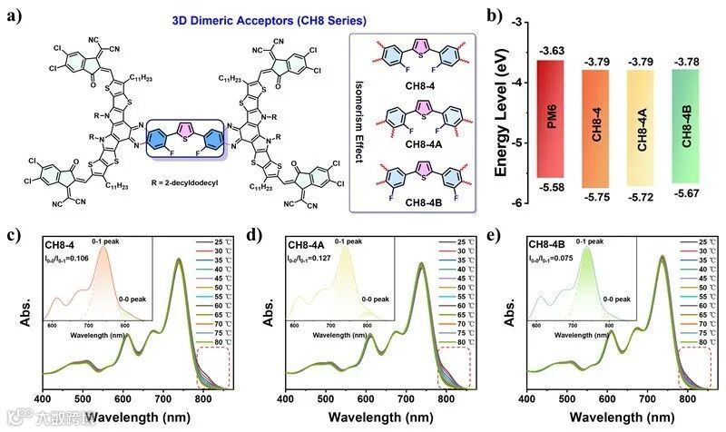 图1. (a) CH8-4、CH8-4A和CH8-4B的化学结构;(b) PM6、CH8-4、CH8-4A和CH8-4B的能级;(c-e) CH8-4、CH8-4A和CH8-4B在25-80 ℃