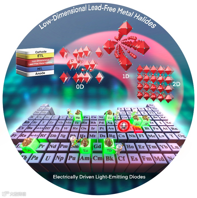 图1. 低维、非铅金属卤化物应用到电致发光器件。图片来源:
