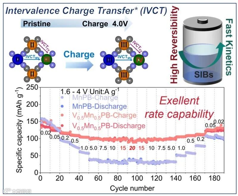 清洁与可持续能源的开发和利用已成为近年来关注的焦点,相关研究推动了合成化学及储能技术领域的发展。钠离子二次电池因其经济性和资源丰富等优势,在储能领域备受关注。由于正极材料直接限制了电池整体的能量密度和输出电压,探索具有稳定和快速的钠离子存储能力的高性能正极材料至关重要。普鲁士蓝类似物(PBAs)凭借其环境友好性和独特的开放式三维晶格结构,成为极具潜力的正极材料。其中锰基普鲁士蓝(MnPBA)因具备低成本、高理论比容量和相当于商业磷酸铁锂的高能量密度,在能源存储系统中具有巨大的应用潜力。然而,MnPBA正极循环过程中Mn3+的Jahn-Teller畸变导致结构失稳、快速容量衰减和动力学迟滞,严重制约其应用。传统改性策略难以从电子调控层面解决这一根本问题,亟须创新设计。近日,山东大学徐立强教授团队报道了一种通过价间电荷转移的策略,构建了一种具备高稳定性、快速动力学及宽温域应用潜力的钠离子电池正极材料。
