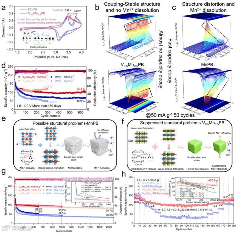 作者采用改进的共沉淀策略制备了一系列新型的钒基离子取代的锰基普鲁士蓝正极材料。作为范例,V0.5Mn0.5PBA提供优异的速率能力(在20 mA-1 g-1和20 A g-1条件下分别为136.9 mAh g-1和94.9 mAh g-1),显著的长循环稳定性(在20 mA g-1条件下循环300圈后91.6%容量保留),宽温域工作范围温度范围内(-50-60℃),超过了大多数报告的钠离子电池正极。通过系统的原位/非原位表征,充分了解了价间电荷转移的内在功能机制和准零应变反应机制,支持其较高的比容量和稳定的循环。研究人员认为锰和铁离子向钒离子的价间电荷转移驱动了材料电子分布从局域到非局域,这增强了电化学反应的可逆性和动力学,并通过降低Mn3+电子简并性减轻了其Jahn-Teller畸变效应。本研究进一步发展了PBAs的电子调谐,为先进的钠离子电池正极材料设计提供了新的途径。