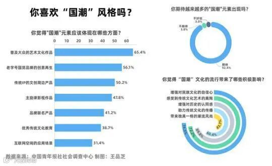 近日,中国青年报社社会调查中心通过问卷网(wenjuan.com),对2012名受访青年进行的一项调查显示,88.6%的受访青年喜欢国潮风格。92.4%的受访青年期待越来越多的国潮元素出现。对于国潮文化,60.3%的受访青年认为守正与创新同等重要。74.5%受访青年觉得国潮文化的流行增强了民族文化自信心。受访青年中,80后占17.3%,85后占16.5%,90后占32.4%,95后占11.7%,00后占22.1%。