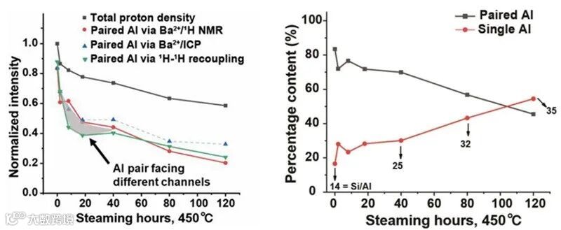图2.水热脱铝过程中铝对定量追踪(左)与单位点铝、铝对后处理调控(右)。