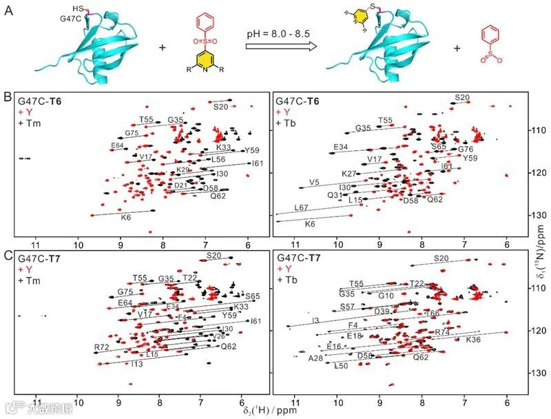 随后研究人员通过Eu3+荧光光谱提取了一系列配体-Eu3+复合物的配体场参数B02,由于该参数直接反映了配体与Ln3+复合物的磁各向异性大小,可以通过该参数评估这类开链配体与顺磁稀土配合物的配体场强弱。与1D NMR谱结果类似,尺寸更大的配位臂衍生配体的配体场参数B02更大,甚至可以超过已报道的DOTA-Ln类配体(图4)。随后,这一系列配体的磁各向异性张量进一步通过人类泛素蛋白质G47C的定点标记进行定量分析和比较(图5)。