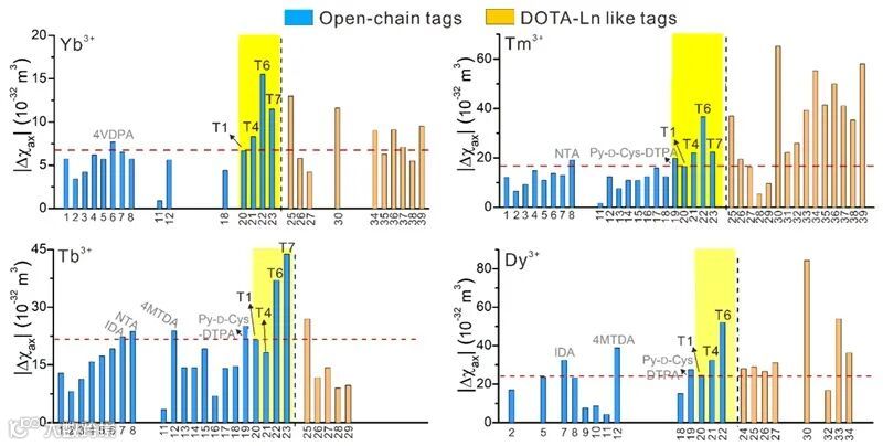 通过分析同位素标记的蛋白质上的核磁信号,利用实验获得的顺磁效应(PCS和RDC)可以对不同配体复合物的磁各向异性张量进行评价。结果发现,所测定的磁各向异性与1D NMR谱的化学位移分布和配体场B02参数具有较强的一致性,动力学构象交换速率低、大尺寸配位臂的配体形成的稀土离子配合物具有较大的磁各向异性张量,并且有些开链配合物的磁性强度与大环类DOTA-Ln相当(图6)。这类大尺寸的开链配体与稀土离子产生的配合物在蛋白质上产生的磁各向异性表现出超强的构象动力学惰性,使得PCS和RDC的平均化程度相当,这对于利用顺磁效应分析生物大分子的动态学研究至关重要,尤其对于生物大分子动态学构象分析和弛豫弥散 (CPMG dispersion) 的实验分析。