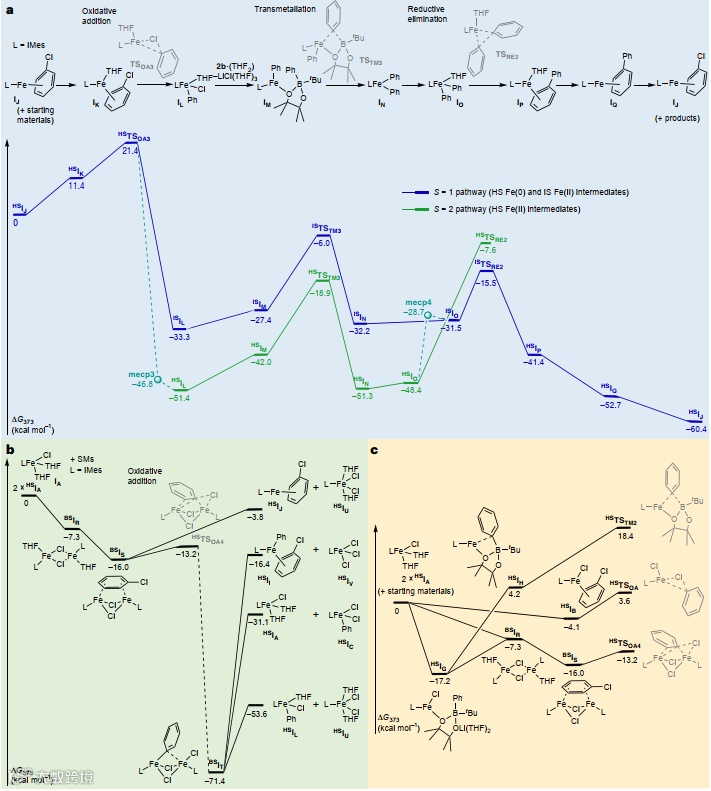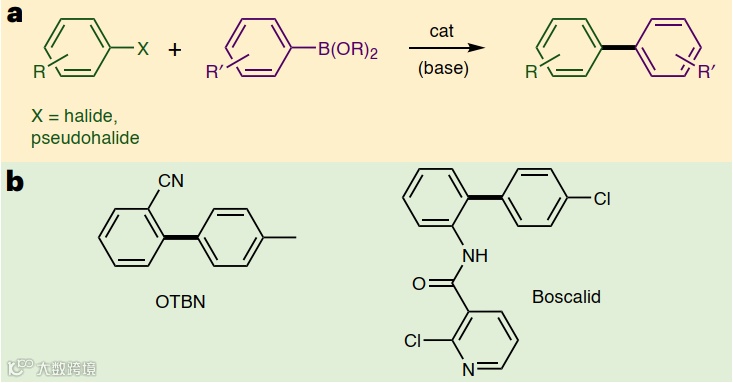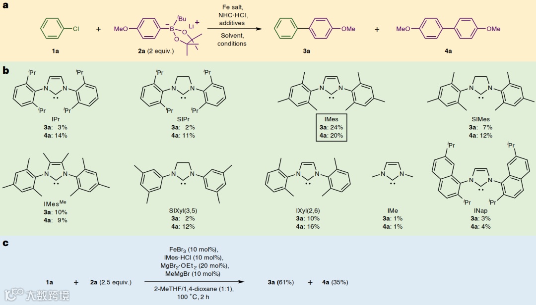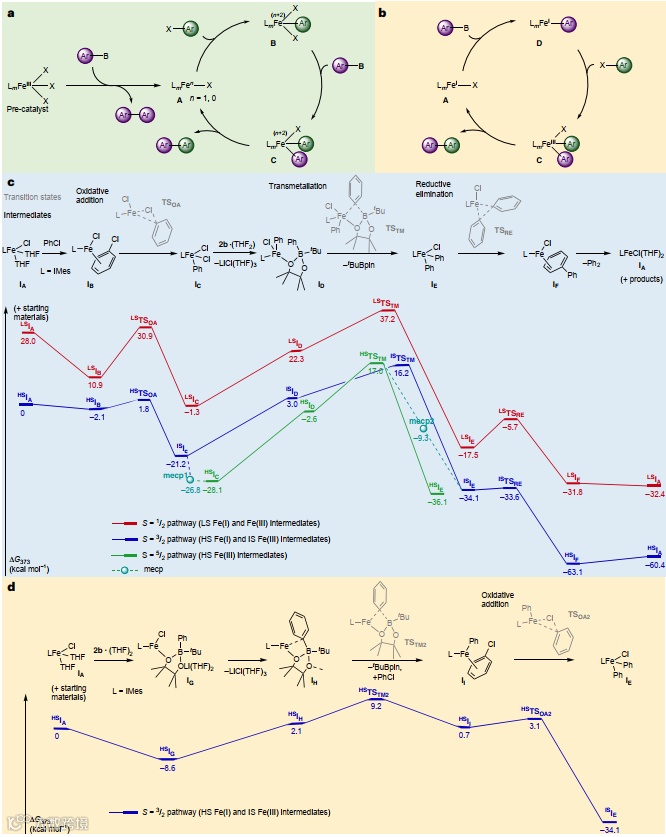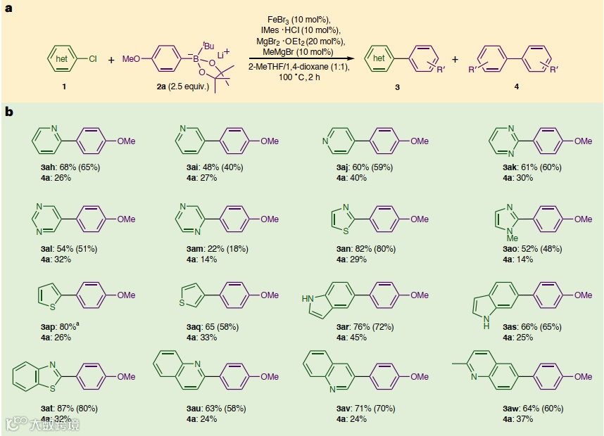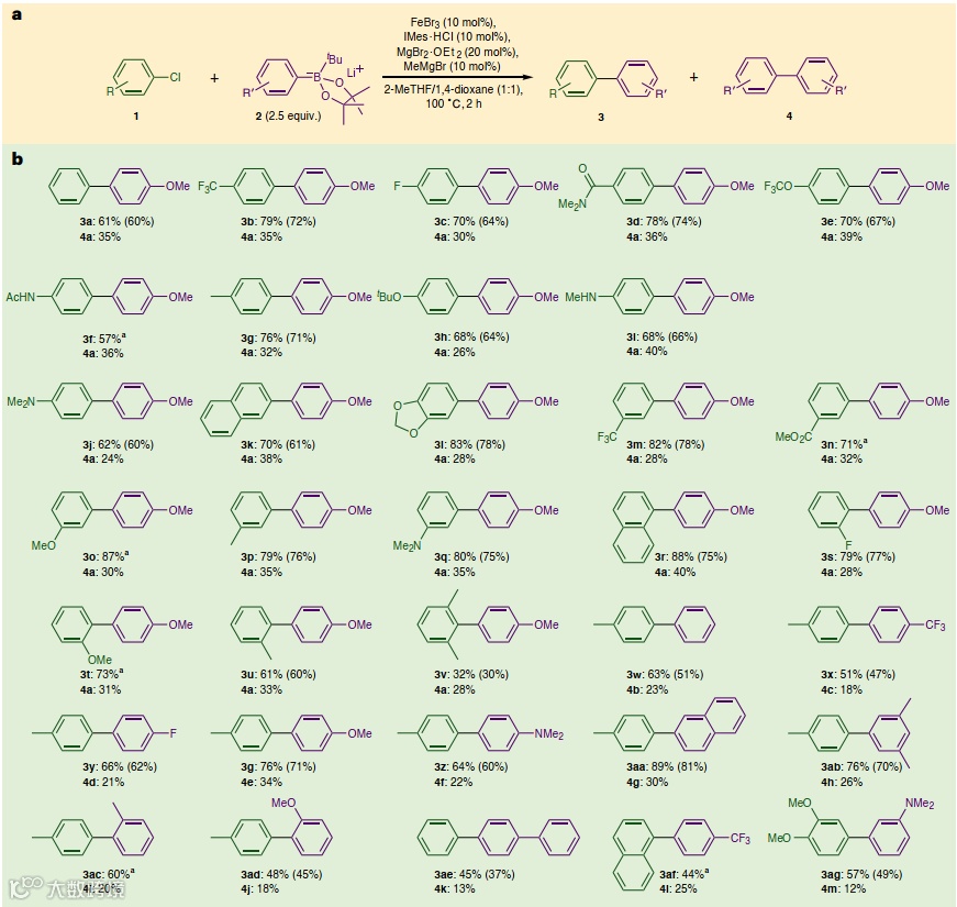 Robin Bedford教授课题组使用含N-杂环卡宾(NHC)配体的简单铁基催化剂催化芳基氯化物与芳基硼酸酯的Suzuki交叉偶联反应,以良好的产率获得了一系列联芳基产物。机理研究表明该反应中铁的最低氧化态可能是Fe(I),芳基氯化物与Fe(I)的氧化加成相对容易进行,而转金属化似乎是反应中的挑战性步骤。