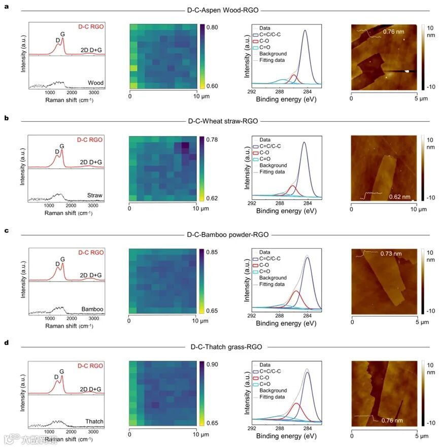 比值的映射。与原始生物质相比,XPS谱和C 1s峰表明C元素比例和C-O的比例都下降了,而C=C成为主要化学键,其比例达80%以上。这些数据表明,生物质在室温下通过脱氢和脱氧转化为以碳元素为主的石墨烯类材料。作者使用AFM表征了各个生物质来源的D-C RGO样品,确定了它们为单层石墨烯的柔性形态。由于范德华力,一些D-C RGO再次堆叠在一起,这是无法避免的。总体上,AFM的表征结果更加印证了来源于生物质的D-C RGO的制备成功。