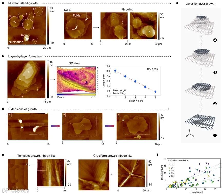达到了0.999,说明这些片层遵循逐层生长模式。此外,在较大面积的少层D-C RGO上,一些新的层随机生长,如图4c所示。通过伪原位AFM监测到了这一现象,其中一个核岛在两小时内长成两层更大的D-C RGO层。因此,图5d总结了逐层生长机制的示意图,该图显示了使用旧层作为模板生长新的D-C RGO片,这类生长方式的