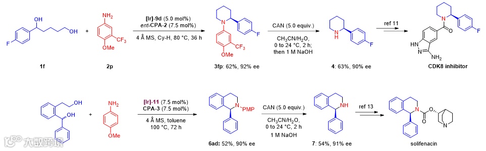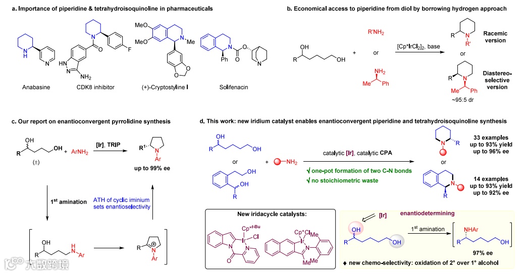 作者通过发展新的铱催化剂,以消旋的1,5-二醇和苯胺为原料,实现了手性哌啶和四氢异喹啉的高对映选择性合成。该工作进一步拓展了借氢反应在手性合成中的应用,为手性氮杂环的合成提供了一种重要方法。
