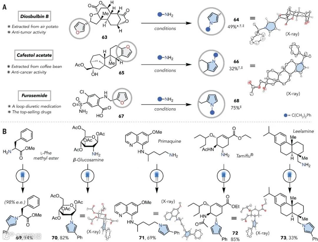 从而成功地将呋喃转化为一系列吡咯类似物,实现了多种复杂分子的后期转化以及生物活性分子的构建。