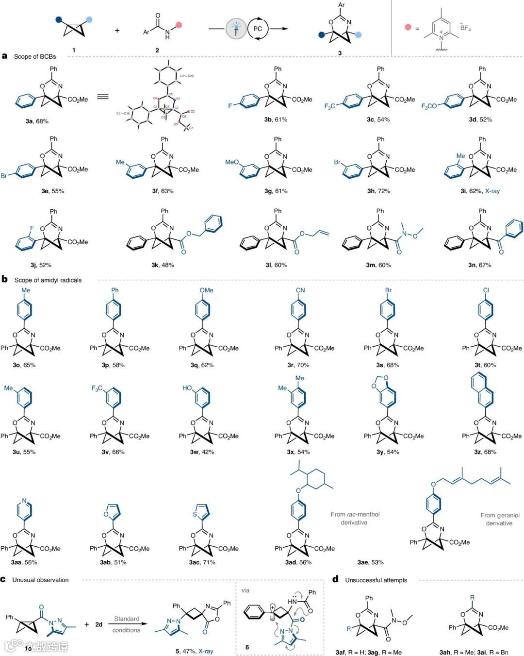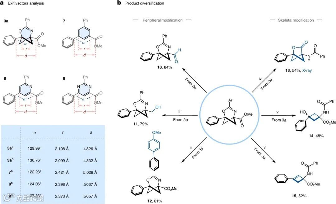 Frank Glorius教授课题组利用光氧化还原催化策略,高区域选择性和化学选择性地将酰胺自由基插入BCBs,成功地构建了一系列2-氧杂-4-氮杂双环[3.1.1]庚-3-烯衍生物,这些产物还可以进行后续衍生化。这些富含C(sp3)的杂双环结构与吡啶和嘧啶衍生物具有几何相似性,很有可能成为这些具有重要药用价值杂环的电子等排体。