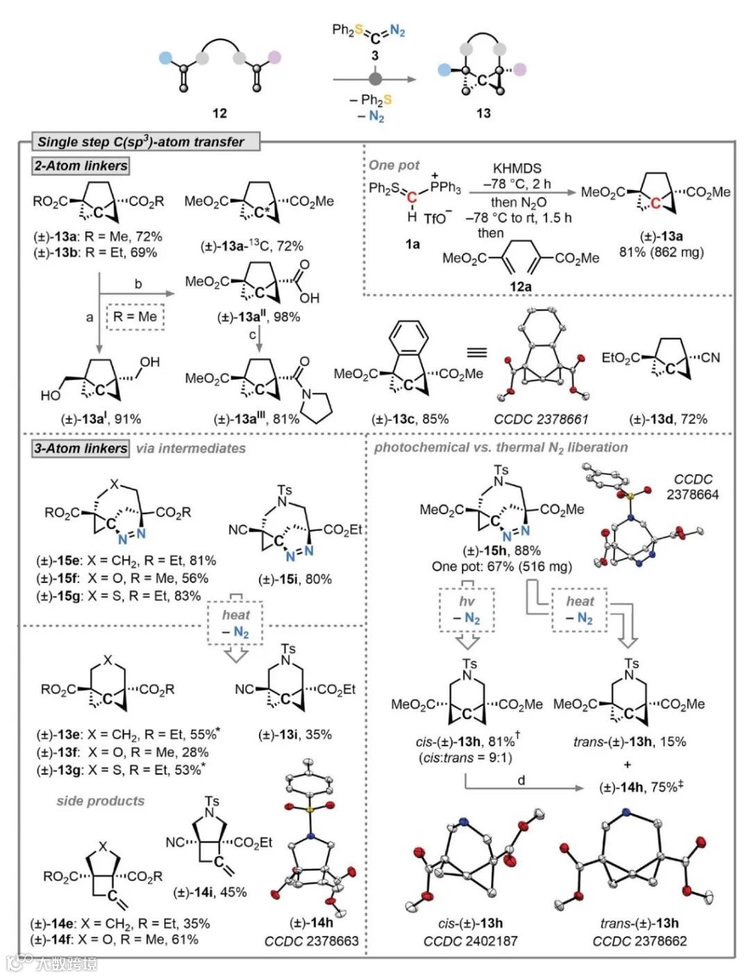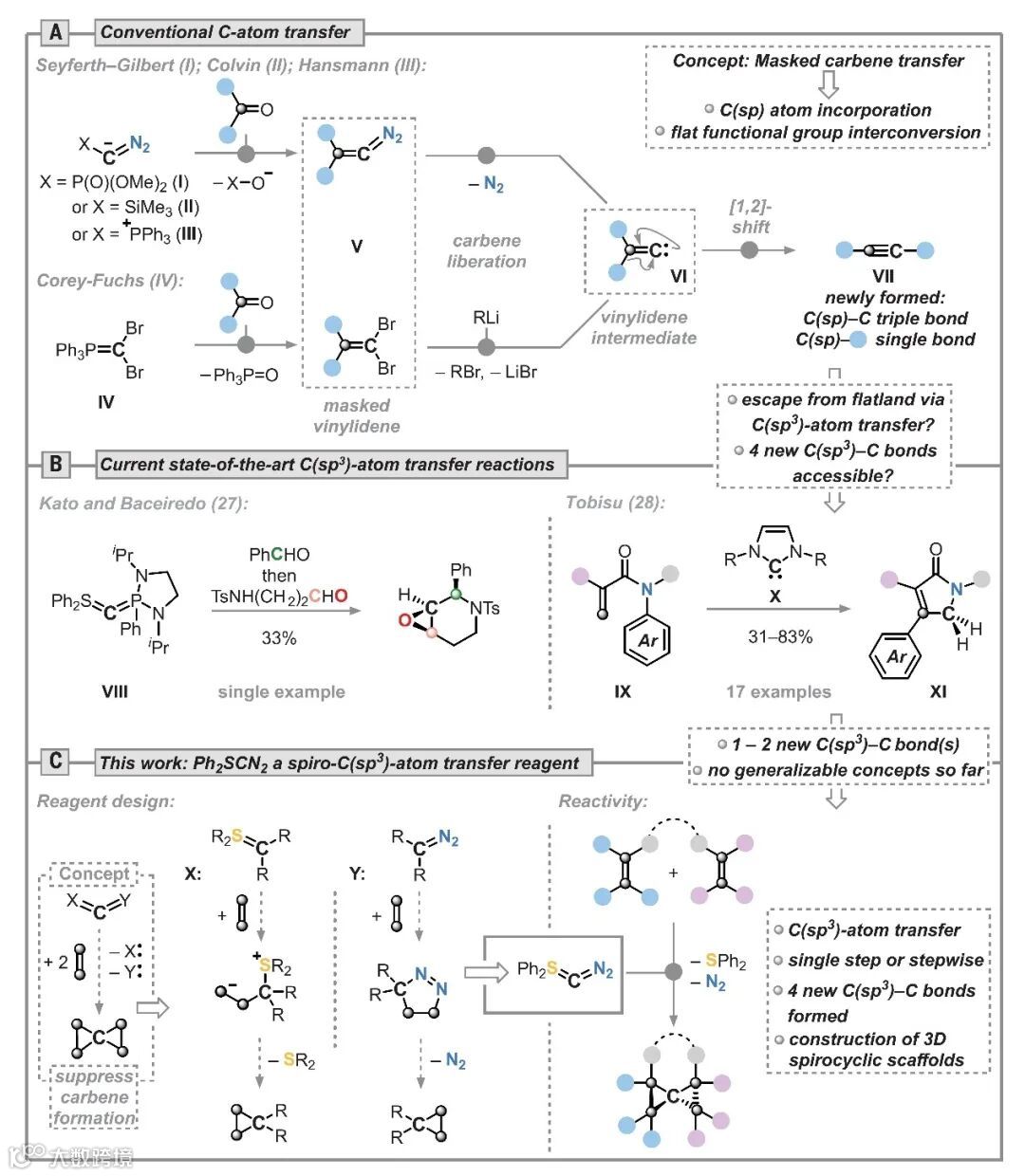 Max M. Hansmann教授团队报道了一种重氮硫叶立德试剂Ph2S=C=N2,成功地实现了C(sp3)原子的精准插入并构建了一系列高张力的3D刚性螺环支架。Ph2S=C=N2是一种广泛适用的C(sp3)原子转移试剂,可在C(sp3)原子周围逐步或单步构建多达四个新的C-C键。该成果将促进对更多C(sp3)原子转移反应的探索,使人们能够获得先进的3D分子骨架,并将碳原子转移扩展到主族和过渡金属化学等其他领域。