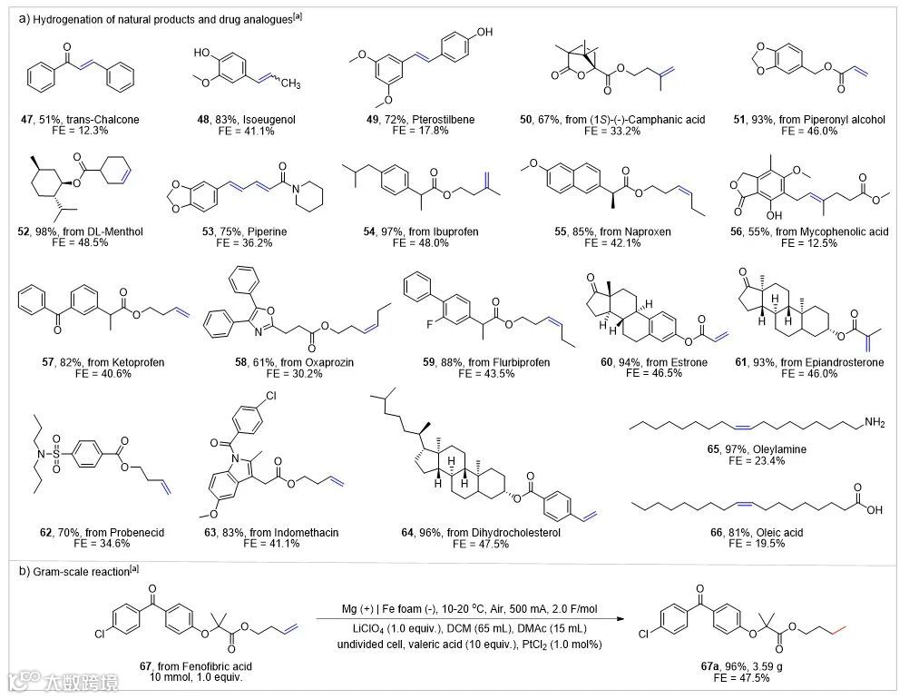 )作为底物进行了10 mmol规模的放大实验,该放大实验可以将催化剂当量降至1 mol%、电流强度升至500 mA,并得到96%的氢化产物,展现出极高的工业化潜力。