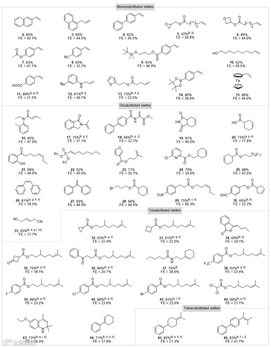 在最优条件下,研究人员对底物的适用范围进行了详细的考察。结果表明,无论是一取代和二取代烯烃(