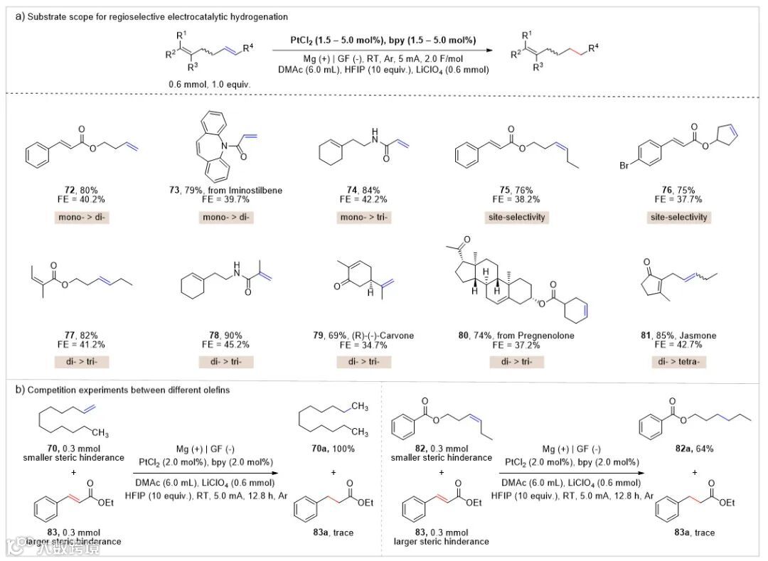 最后,研究人员通过引入2,2-联吡啶作为配体实现了二烯的高区域选择性电催化氢化为单烯,同时通过对比实验和DFT计算探究了该区域选择性的来源主要是碳碳双键的空间位阻差异。