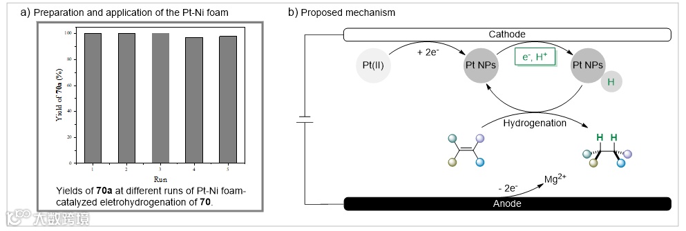 随后,研究人员进行了一系列实验来探究反应机理。主要的机理实验:首先,通过氘代实验发现氢源主要来自于体系中的质子源;其次,通过用氢气代替质子源的实验发现氢源不是来自于体系中原位产生的氢气;然后,通过透射电镜等检测实验确定了体系中确实有波纳米颗粒生成;最后,通过制备铂纳米颗粒沉积的泡沫镍电极实现了非活化烯烃的电催化氢化,并且重复使用五次之后氢化性能几乎没有衰减。结合上述实验结果,研究人员提出了可能的机理: