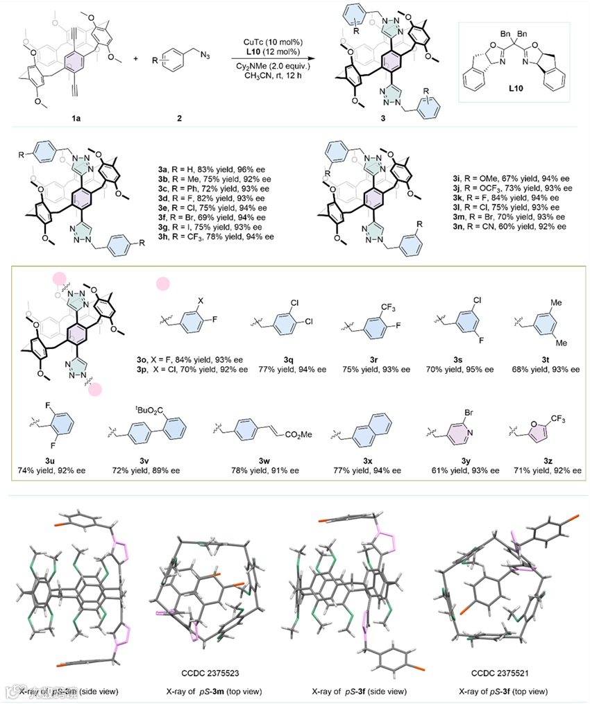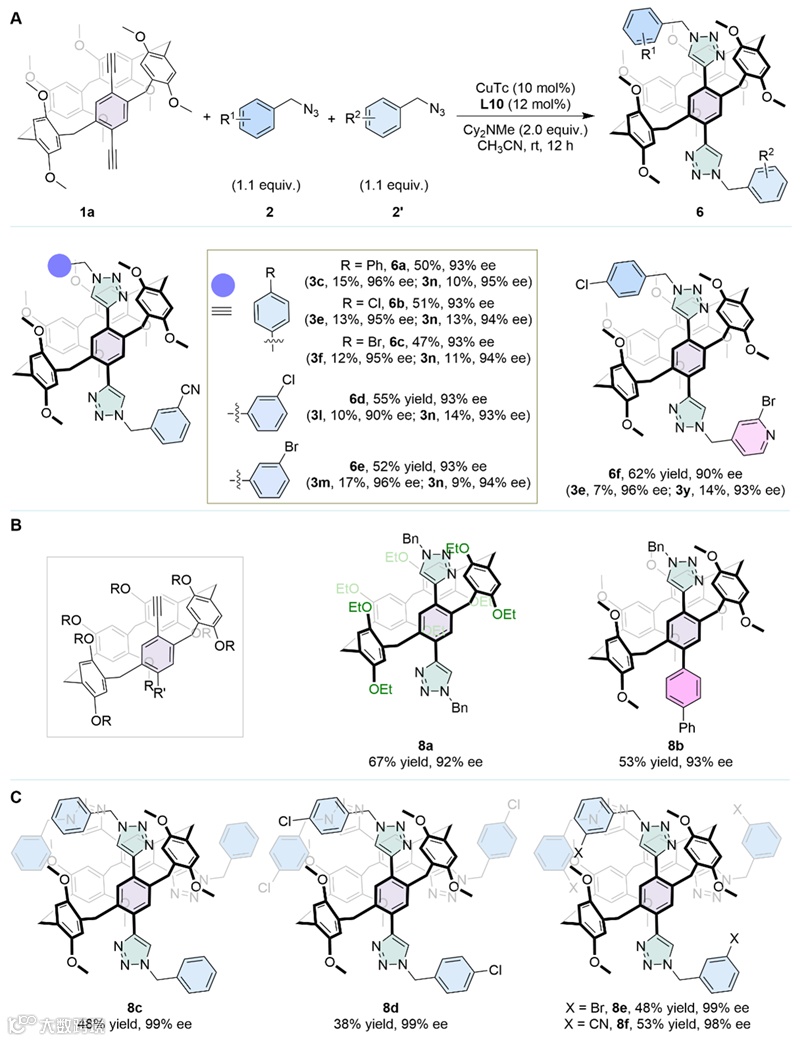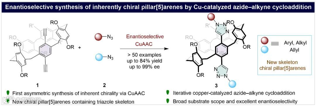 ”。该研究基于铜催化的Click反应,通过“不对称边臂延伸”策略实现了高对映选择性的合成一系列含三氮唑新颖骨架的固有手性柱[5]芳烃。