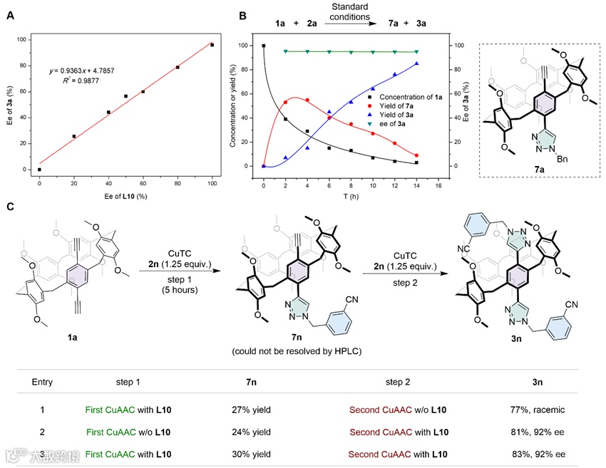 通过一系列机理实验研究,该团队揭示了反应的关键中间体和反应路径。实验结果表明,反应是分步进行的,并且立体选择性控制发生在第二步的Click反应过程(图4)。