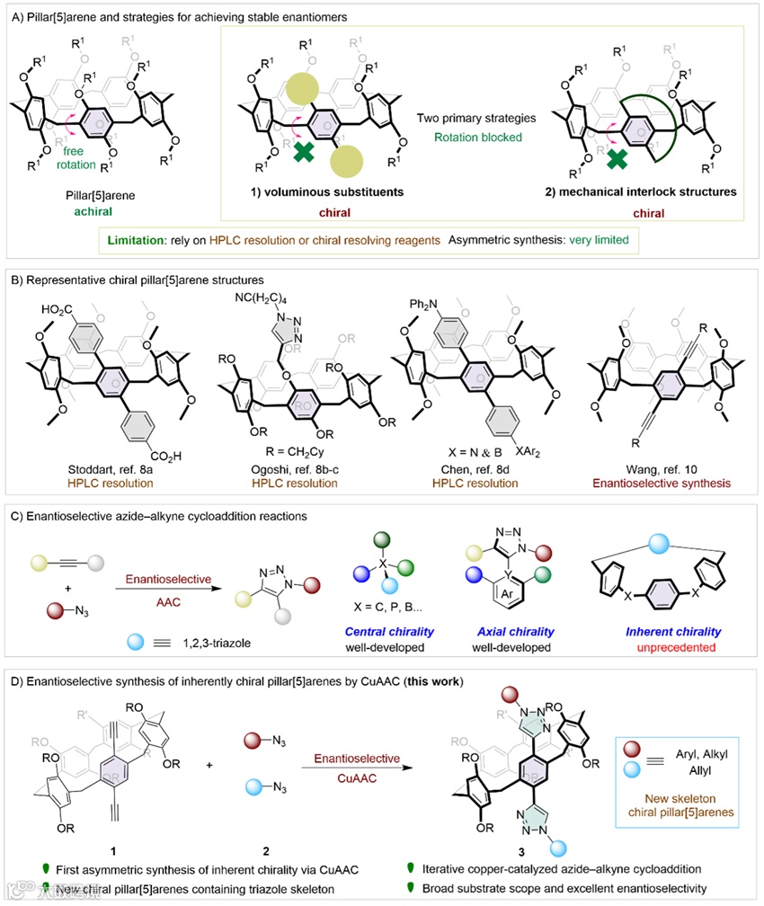 , e202407752),通过铜催化Click反应构建固有手性柱[5]芳烃,有别于去对称化策略,该反应是通过延长柱芳烃的边臂限制其内消旋化实现立体选择性控制(图1)。