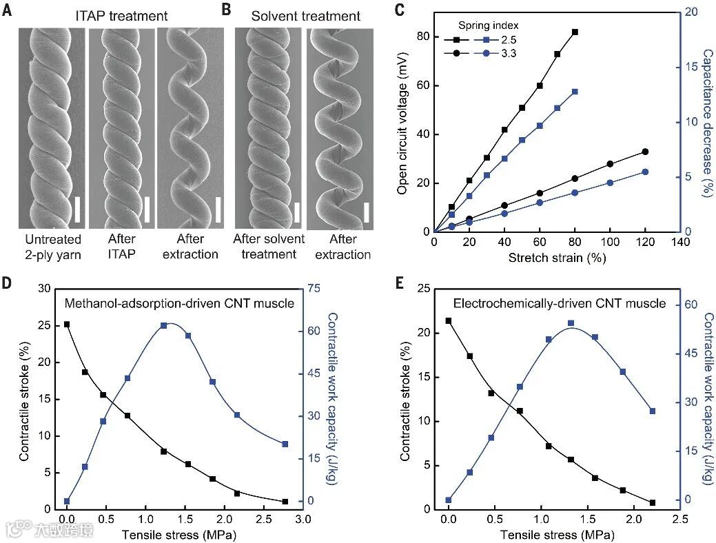 机器人手臂收缩。图片来源:Science 原文(扫描或长按二维码,识别后直达原文页面):Mandrel-free fabrication of giant spring-index and stroke muscles for diverse applicationsMengmeng Zhang, Shaoli Fang, Wenting Cai, Chi Huynh, Fatma Göktepe, Jiyoung Oh, Zhong Wang, Ishara Ekanayake, Özer Göktepe, Ray H. BaughmanScience 2025387, 1101-1108. DOI: 10.1126/science.adr6708 参考文献:[1] S. Carter, et al., New twist on artificial muscles. PNAS 2016, 113, 11709-11716. DOI: 10.1073/pnas.1605273113[2] J. Foroughi, et al., Torsional Carbon Nanotube Artificial Muscles. Science 2011, 334, 494-497. DOI: 10.1126/science.1211220[3] D. Márcio, et al., Electrically, Chemically, and Photonically Powered Torsional and Tensile Actuation of Hybrid Carbon Nanotube Yarn Muscles. Science 2012, 338, 928-932. DOI: 10.1126/science.1226762[4] S. Tawfick & Y. Tang, Stronger artificial muscles, with a twist. Science 2019, 365, 125-126. DOI: 10.1126/science.aax7304[5] J. Zhang, Ply for a large stroke. Science 2025, 387, 1038-1039. DOI: 10.1126/science.adw2181#f1 导师介绍Ray H. Baughmanhttps://www.x-mol.com/university/faculty/6447 (本文由小希供稿)