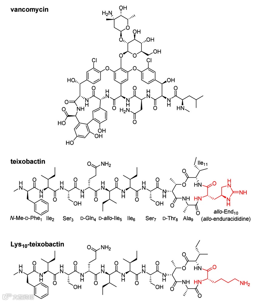 自1958年万古霉素(Vancomycin)临床应用以来,它一直是治疗多重耐药革兰氏阳性病原菌的“最后一道防线”。万古霉素通过结合细菌细胞壁合成过程中的关键分子——lipid II的D-丙氨酰-D-丙氨酸(D-Ala-D-Ala)部分,从而抑制细胞壁的生物合成,导致细菌死亡。然而,随着万古霉素耐药菌的出现,如万古霉素耐药肠球菌(VRE)和万古霉素耐药金黄色葡萄球菌(VRSA),这一防线正面临前所未有的挑战。在细菌耐药机制中,一个常见策略是改变万古霉素的靶点结构。例如,VRE通过将D-Ala-D-Ala替换为D-丙氨酰-D-乳酸(D-Ala-D-Lac),从而破坏了万古霉素与lipid II之间结合的关键氢键,导致万古霉素的亲和力降低至此前的千分之一。近年来,泰斯巴汀(Teixobactin)作为一种新型抗生素,引起了科学界的广泛关注。泰斯巴汀是一种由11个氨基酸组成的环缩肽,它通过结合lipid II的焦磷酸基团,抑制细胞壁的生物合成并最终导致细菌裂解。由于泰斯巴汀针对的是lipid II的焦磷酸基团,这是一个在细菌中高度保守的靶点,因此革兰氏阳性细菌几乎无法对其产生耐药性。泰斯巴汀对包括耐甲氧西林金黄色葡萄球菌(MRSA)、VRE和肺炎链球菌在内的多种革兰氏阳性细菌展现出强大的抗菌活性,最低抑菌浓度(MIC)低至0.005-0.5 μg/mL。尽管泰斯巴汀具有强大的抗菌活性,但其临床应用仍面临一些挑战。例如,泰斯巴汀的生产成本较高,且其稳定性有待进一步提高。因此,研究人员开始探索将泰斯巴汀与其他抗生素结合的策略,以期在保持或提高抗菌活性的同时,克服单一抗生素的局限性。