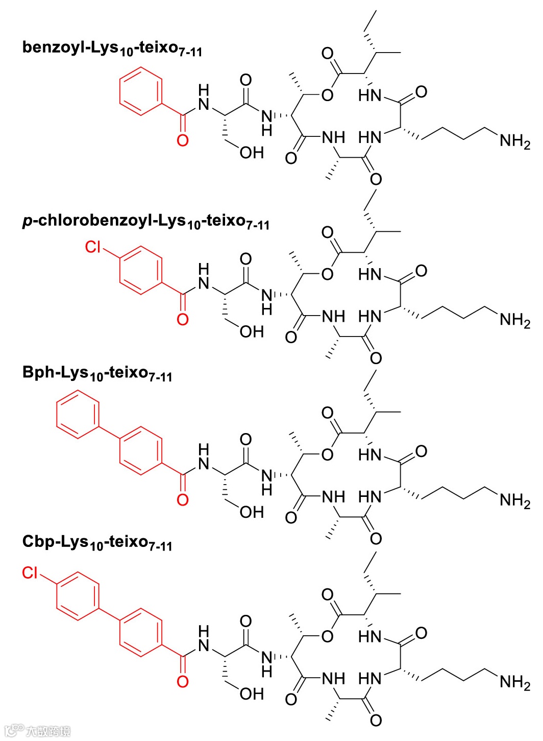 。这些截短类似物中,泰斯巴汀的疏水尾部(残基1-6)替换为芳香族或氯芳香族亲脂基团,旨在通过增强与细菌细胞膜的相互作用,提高偶联物的抗菌活性。研究团队评估了它们的抗菌活性,结果显示,与万古霉素相比,benzoyl-Ly